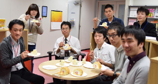 | Prof. Funatomi joined our lab. Since his birthday was a week ago, he celebrated his arrival and birthday with a cake. |