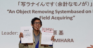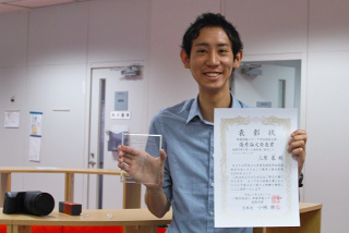 | Hajime won the Best Paper Presentation Award for his research on light field presented at the Kansai-section Joint Convention of Institute of Electrical Engineering in November last year. The certificate will be displayed in the laboratory. |