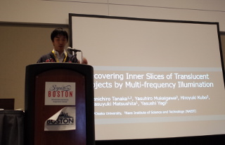 | Kenichiro's research on multiple high-frequency illumination was accepted as an oral presentation at CVPR2015, a top conference in the field of computer vision, so he went to Boston for presentation with Prof. Mukaigawa. | |