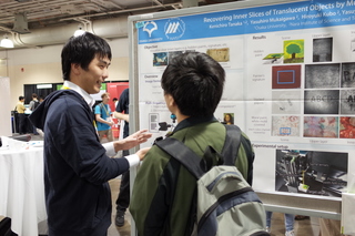 | At the CVIM workshop held at Miraikan, Takafumi presented the results of joint research with Yanmar Co., Ltd. Ms. Inoshita (currently Canon) presented ``Shape from Scattering: Shape Estimation for Translucent Objects based on Light Transport Analysis'' in the doctoral session. | |