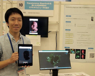 | Prof. Kubo presented his research of `Introduction of Real-time Rendering of Subsurface Scattering according to Translucency' at CEDEC2015. He demonstrated it on a smartphone, which was believed to require enormous amount of computational time. This achievement got Audience Award. |