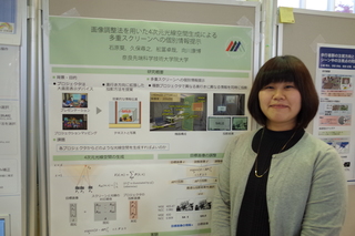 | IPSJ CVIM/GCAD Workshop was held in Kobe, Aoi presented her work about image projection onto multi-layered screens by generating 4-D light field. She got much advice from computer graphics folks as well as computer vision folks. |