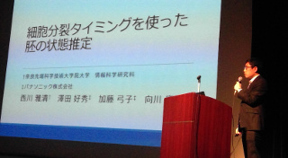 | Masakiyo also presented a research on the embryo status estimation using cell division timing. This is a result of the collaborative research with Panasonic. |