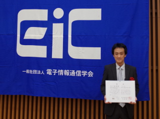 | After that, Mr. Asada received a certificate and a thesis award. This award is given to the outstanding paper published from October 2015 to September 2016 in IEICE journal. We continue the research on optical replicas proposed in this paper. |