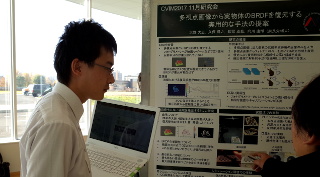 | Fusataka presented a research on the contact imaging at CVIM workshop held at NII. This is a result of the joint research with Panasonic. Shun also presented a research on the design of the multi-spectral camera. This is a result of the joint research with Yanmar. Dr. Aoto presented a research on the viscoelasticity estimation using ultrasonic vibration. Fusataka won the presentation award. |