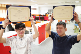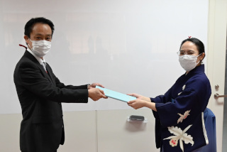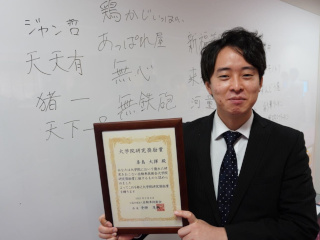 | A diploma awarding ceremony was held, and Xiangkun and Yuri received their master's degrees. The degree certificates were handed over by Prof. Mukaigawa. |