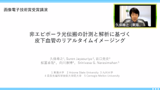 | Prof. Kubo received the Technical Award from the Institute of Image Electronics Engineers of Japan for his research results on vascular imaging developed during his stay at Carnegie Mellon University. After the award ceremony, he introduced the principle in the technical award lecture. |