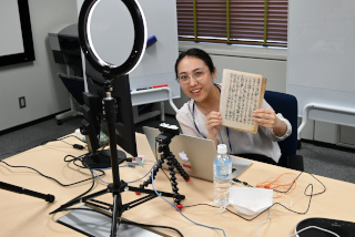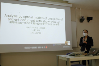 | At the International Conference on Machine Vision Application (MVA2021) held online, Yuri presented research on improving the appearance of ancient documents, and Takahiro presented research on clarifying foreign substances in food. Various props are prepared where the camera does not show. |