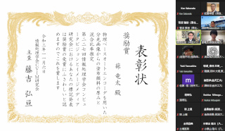 | The CVIM, CGVI, DCC joint workshop was held online. Ryuta presented the physics-based autoencoder, Takamasa presented the analysis of tumulus pigments, and Prof. Funatomi presented the geometric transformation. Ryuta received the Encouragement Award. |