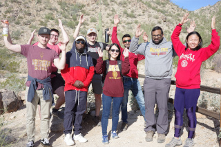 | A photo was delivered from Mayuka, who is currently studying at Arizona State University. She went hiking in South Mountain Park with the lab members. Everyone is doing a cactus pose. |