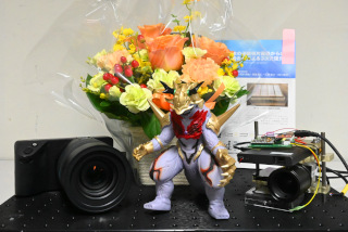| We received bouquets from alumni Mr. Mihara, Mr. Ohno, Mr. Kajiwara, and Mr. Ueda to celebrate the 10th anniversary of our laboratory. We took some photos of them with some items related to their research. |