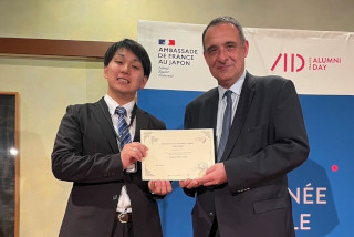 | Akihiro was selected as a French government scholarship student and attended the `France Alumni Day' held at the French Embassy. He passed the highly competitive application process and will start his six-month study abroad in France in September. |