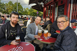 | Professor Funatomi has started a two-week business trip to visit several related universities in France. In the northern city of Amiens, after a research meeting with our collaborators, Professor Mouaddib, and Jordan, who stayed in our lab five years ago, they enjoyed some beer together. |