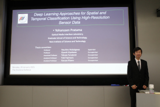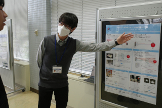 | An exchange meeting was held as part of the collaborative education program launched between NAIST and Nara National College of Technology (Nara KOSEN). Ippei, Akihiro, and Kengo each gave presentations to the participants from Nara KOSEN, introducing their respective research activities. |