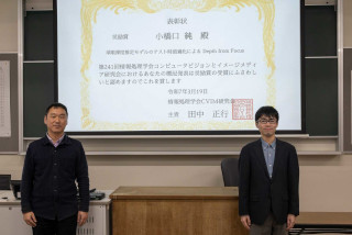 | At the CVIM Workshop held at Shiga University, Tomoya presented his research on depth interpolation for confocal images, and Jun presented his research on Depth from Focus. Jun received the Encouragement Award. |