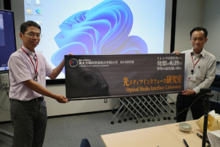 | There was no sign at the entrance of our lab until now. Prof. Funatomi kindly made a tapestry-style sign for us, using his own money, as a gift. It will be the new face of our lab from now on. |