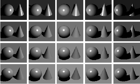 フォトメトリックステレオ法など, 光源方向を変化させた時の陰影の変化を手がかりにシーンを解析する手法がある. 著者も,光源方向を変化させた時の陰影の変化から, 拡散反射・鏡面反射や影などの光学現象を分類する研究をしている. これらの研究では, 環境光が存在しないなどの理想的な照明環境を想定していることが多い. しかし,現実には完全に理想的な照明環境で実験するのは難しい. そこで,POV-Rayでレンダリングした合成画像を用いてシミュレーション実験を行った.図6は,カメラと物体を固定し, 光源位置だけを変化させてレンダリングした画像である. 光源は垂直方向に4方向,水平方向に5方向の20方向に変化させた. 単に,3次元座標を2次元座標に射影する幾何計算だけなら簡単であるが, 影を正確に描画するのは,自作プログラムでは面倒である. この実験では,シーンファイルを Perlプログラムで出力して, 20枚の画像をPOV-Rayでレンダリングした. これらの画像を用いた実験により, 理想的な照明環境で定量的な評価を行った.