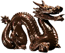 物体表面の反射特性は,双方向反射率分布関数(BRDF)で記述できる. 著者は,実物体のBRDFを1度刻みで計測できるシステムを開発している. 図8(a)が計測の対象となる硬貨であり, 図8(b)に示すシステムで等方性BRDFを計測した. これにより,ある光源方向からの入射光照度に対する 視点方向への反射光輝度の比率を, 3次元配列として記録した. しかし,パラメトリック反射モデルを利用せず, 反射率を密に記録した数値データを直接用いて 画像をレンダリングできるソフトは見当たらない.そこで,計測したBRDFに基づいて画像をレンダリングできるように, POV-Rayを改造した. 図8(c)は,(a)の反射特性を持った竜の形状をレンダリングした結果である. 前述のように,POV-Rayのソースコードはきれいに書かれているため, 改造は容易であった. 実際には,Phongモデルで反射光強度を計算する関数 void do_phong()の中身を, 計測したBRDFに基づいて画像をレンダリングするように書き換えた.