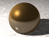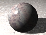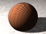 材質を変えてレンダリング:material.pov #include "colors.inc" #include "shapes.inc" #include "woods.inc" #include "stones.inc" #include "glass.inc" #include "metals.inc" camera{ location <-3,3,7> look_at <0,0,0> angle 30 } light_source{ <5,6,5> color White*2} object{ Plane_XZ translate <0,-1,0> texture{T_Stone8} } object{ Sphere scale 1.4 // 標準インクルードファイルに含まれているテクスチャを利用する texture {T_Wood1 scale 2 } // texture {T_Stone9} // texture {T_Dark_Green_Glass} // texture {T_Brass_3B} }
