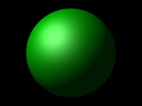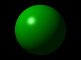 シーンファイルのサンプル:sample.pov camera{ location <0,0,6> look_at <0,0,0> angle 30 } light_source{ <5,5,5> color rgb <1,1,1>} object{ sphere { <0, 0, 0>, 1} pigment{ color <0,1,0>} }次に,このシーンファイルをPOV-Rayでレンダリングすると, 図2のような画像が生成される. シーンを記述するためには, カメラ・光源・物体を記述しなければならない. camera{ … }がカメラに関する定義であり, カメラ位置や視線方向,画角を定義している. light_source{ … }が光源に関する定義であり, 光源位置と照明色を定義している. object{ … }が物体に関する定義であり, 形状(球)と表面色を定義している. 詳しい説明は省略するが,きれいに構造化されているため, 大体の意味は理解できるだろう.